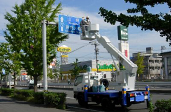 高輝度反射材や多言語ピクトを採用した標識を設計・更新。設置診断士研修の知見を活かし老朽度評価から施工・維持管理までワンストップ対応。県警と連携し、自動運転支援にも資する正確な情報提供を行います。
